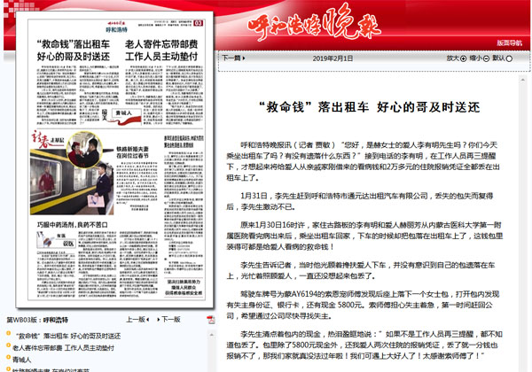 | ”救命錢”落出租車 首府好心的哥及時送還 |