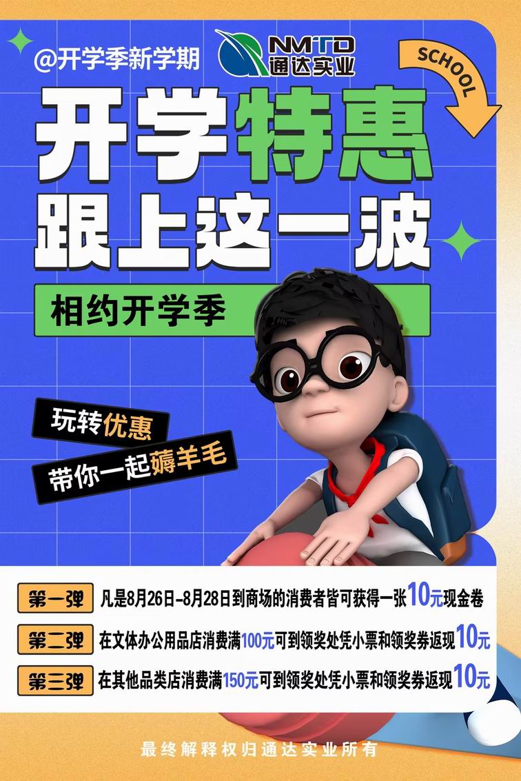 9月臨近,又迎來(lái)一年開(kāi)學(xué)的日子。每一年的開(kāi)學(xué),令眾多學(xué)子向往,充滿(mǎn)希翼和對(duì)未知的渴望,它開(kāi)啟了童年、少年、青年的求知夢(mèng)想,記錄了稚嫩、豆蔻、青蔥的歲月年華。8月底,通達(dá)商場(chǎng)推出開(kāi)學(xué)季促銷(xiāo)活動(dòng),全商場(chǎng)特賣(mài)一降到底,新學(xué)期用品推出特價(jià),為學(xué)子獻(xiàn)上開(kāi)學(xué)大禮。